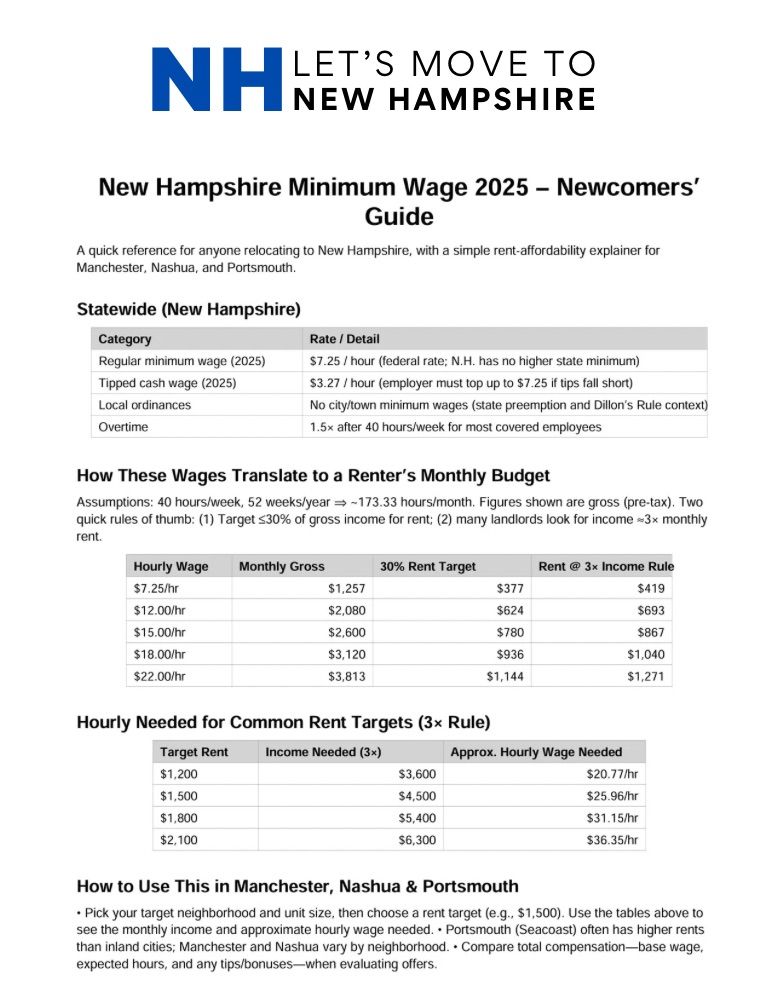 If you’re moving to New Hampshire for work in 2025, here’s the pay-floor reality on Day 1: the state follows the federal minimum wage of $7.25 per hour, with no higher local city or town wageanywhere in the state. For service workers who earn tips, the minimum cash wage is $3.27 per hour(roughly 45% of the regular minimum), and employers must ensure that cash pay plus tips reaches at least $7.25 each pay period.